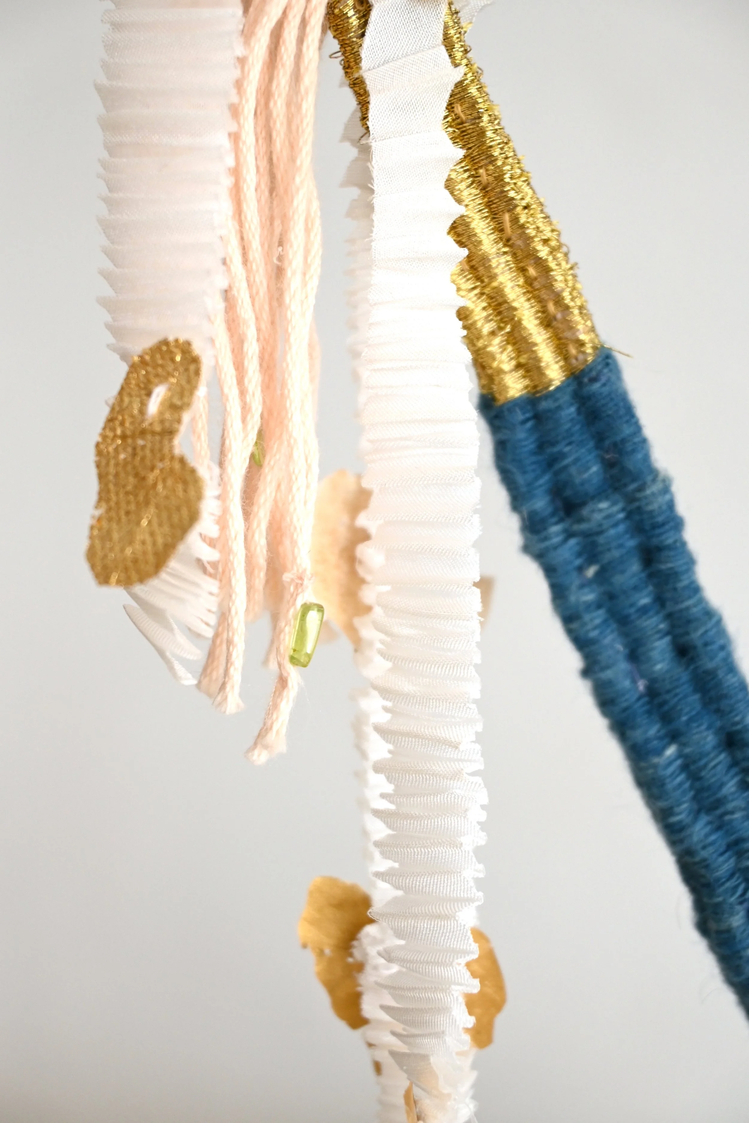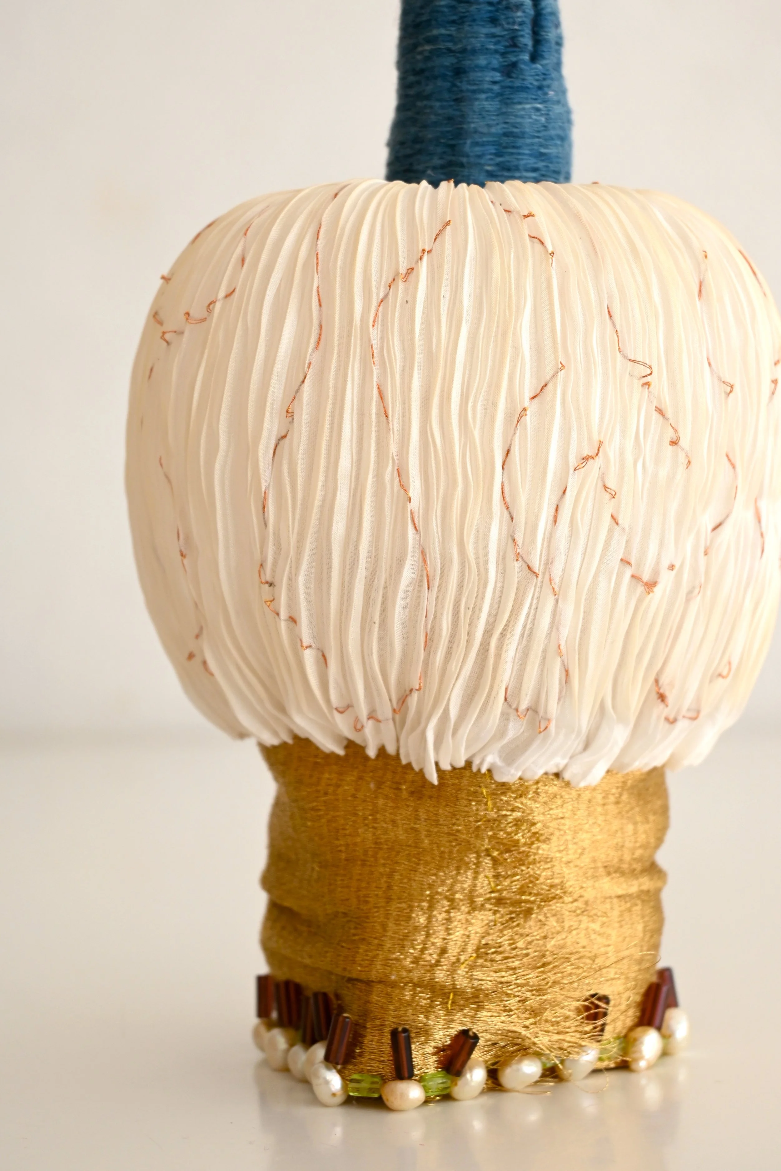 Hand Pleated silk with embroidery, handwoven native Oaxacan Cotton dyed with indigo and hand spun, handwoven god thread,goldleaf, cotton,naturally dyed silks, antique velvet, semi precious stones and freshwater pearls, thread, mixed media base structure.
